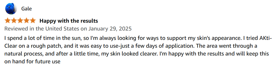 "I've been using the AKti-Clear on scaly patches that I've had for years, and that nothing I've tried would remedy. I applied the treatment and covered it for a few days as directed and later treated the healing areas with a high quality creme. They are gone, I still can't believe it . Thank you"